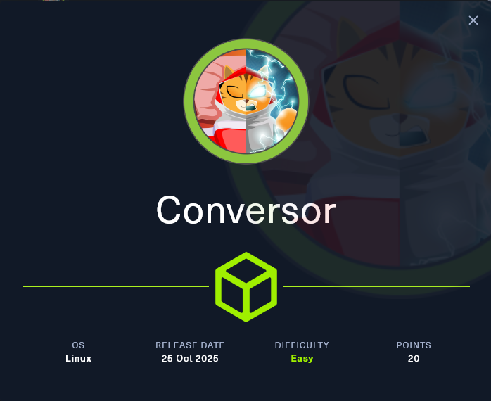 Conversor is an easy Linux machine from Hack The Box. Foothold is a bit tricky if you are unfamiliar with XML and skip over small details. We get a page which converts XML data into a nice looking website, the site also gives us the source code to the site which shows an INSTALL.md file that reveals that the server is executing python scripts from a certain directory. Using an XMLT file a python script is uploaded and we get a reverse shell as www-data, inside the server we can read the database from where we can get another user’s password. This user can SSH into the box and can run an outdated binary as sudo. Using a public POC we can get root.