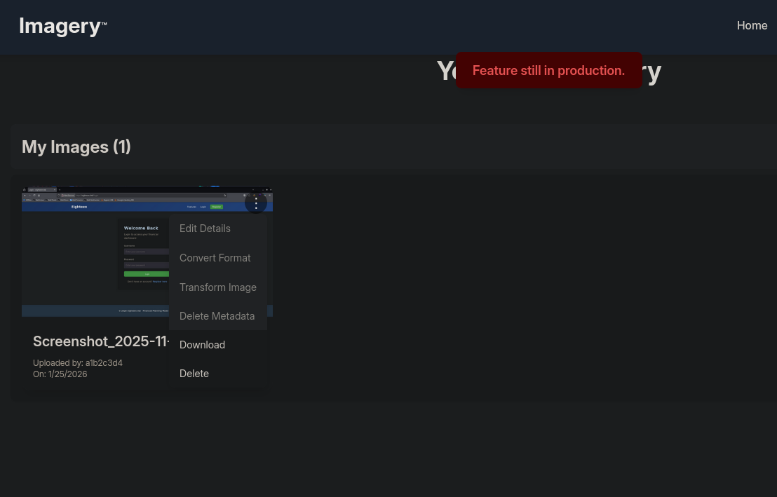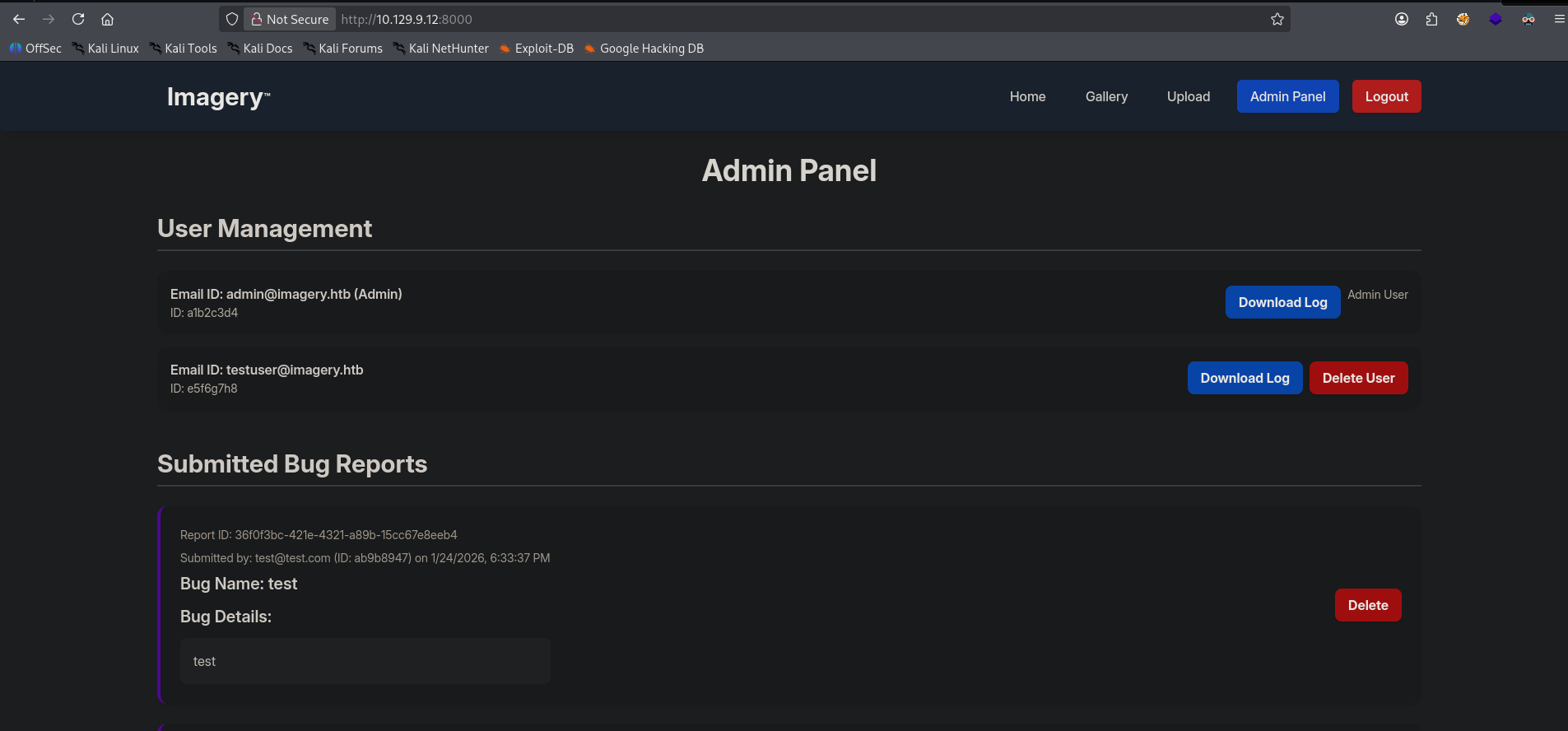 {'displayId': 'a1b2c3d4', 'isAdmin': True, 'is_impersonating_testuser': False, 'is_testuser_account': False, 'username': 'admin@imagery.htb'}
