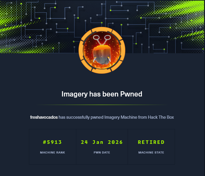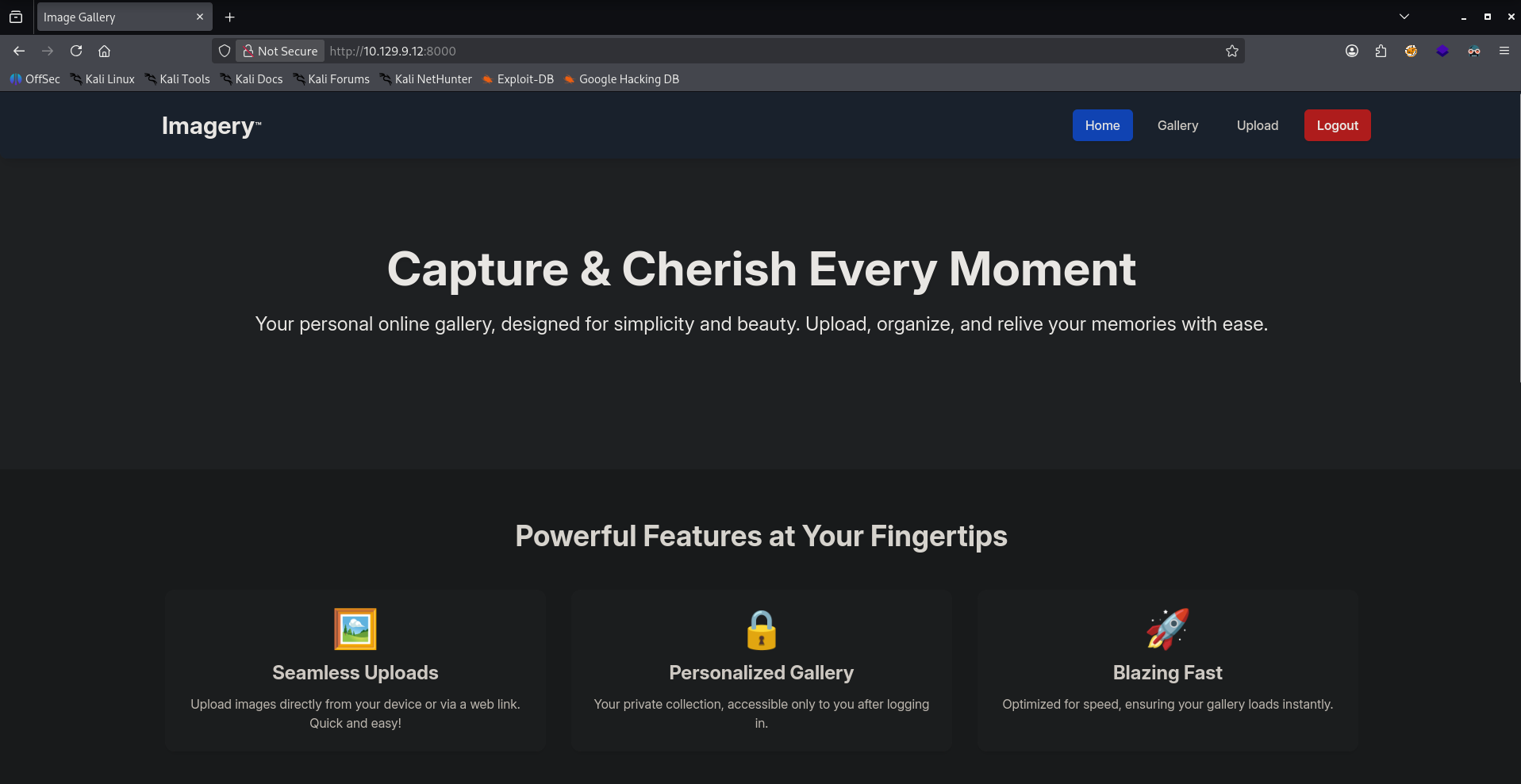 Imagery is a medium difficulty box. The box has a Flask app running on port 8000, after registering an account we are able to upload different files. We are able to gain access to an admin cookie via XSS. The admin panel is vulnerable to LFI which lets us view the source code. The source code contains credentials for a test user which has access to some demo features, one of them being vulnerable to code injection. The host has a backup directory which contains an encrypted zip file of an old version of the source code which contained credentials for mark, a user on the box. Mark is able to run charcol on the box as sudo which can be abused to gain a root shell by setting up a cronjob.