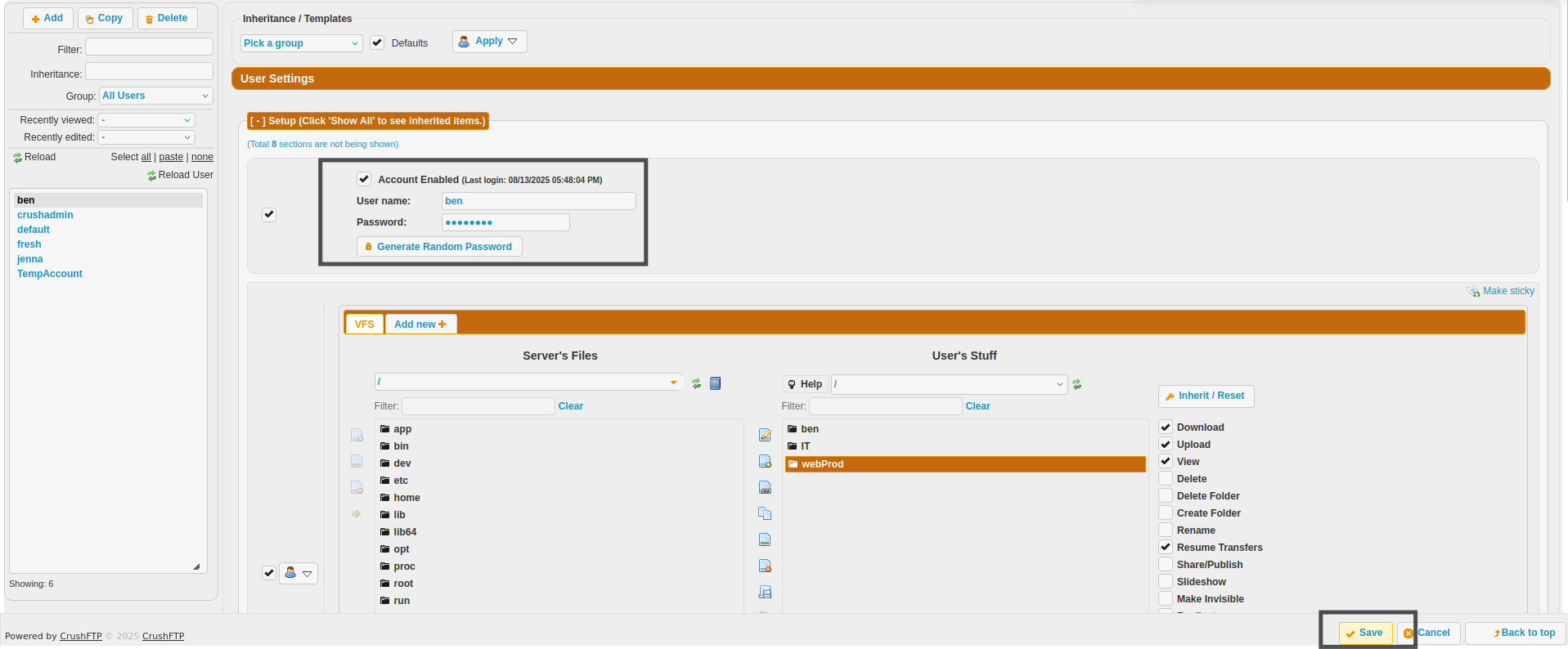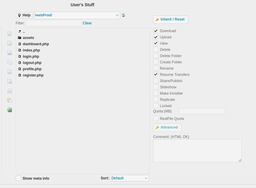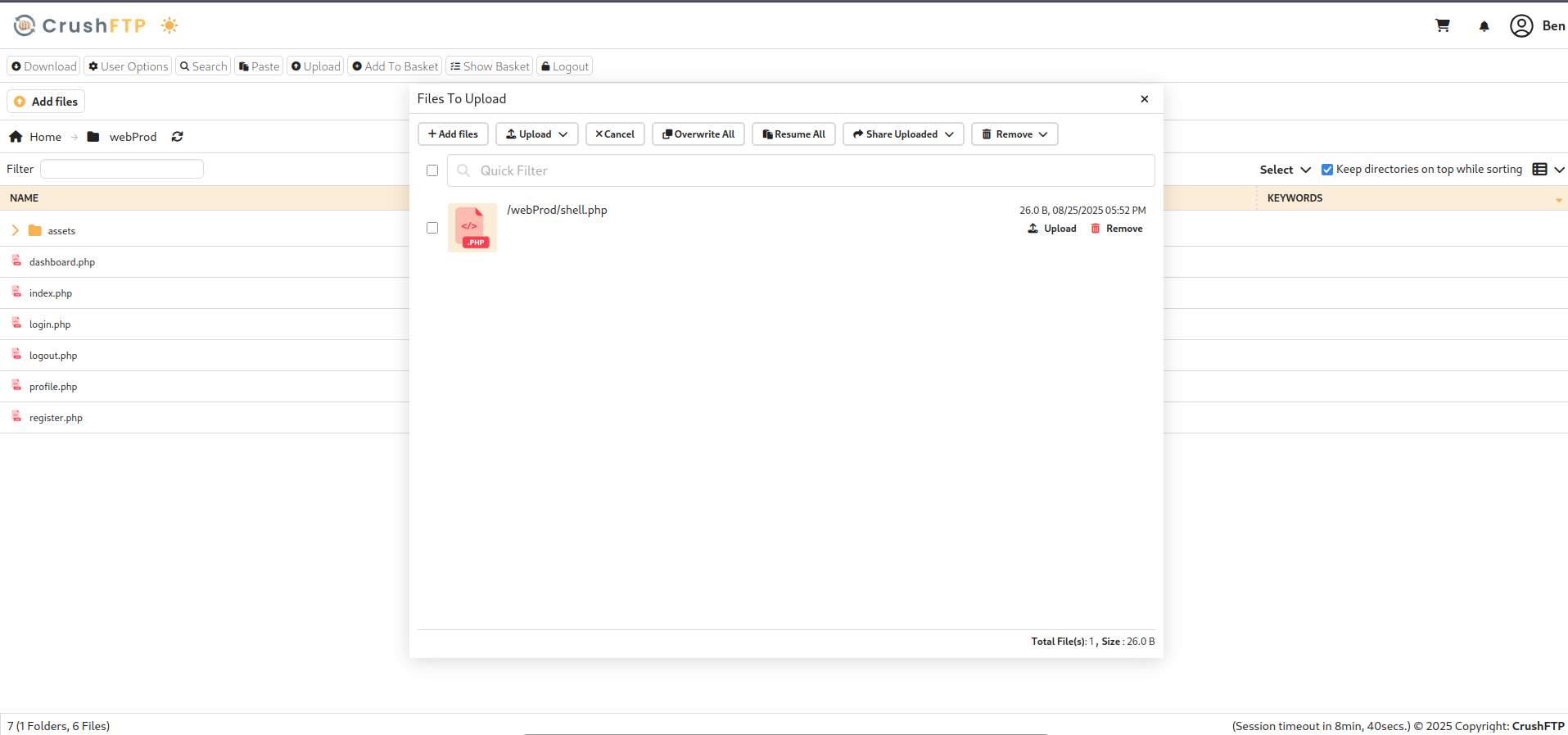 This works and we can logout and log back in with ben’s newly set credentials which lets us access his files. Going inside of WebProd allows us to upload files. In this case I uploaded a simple PHP shell with the following contents:
