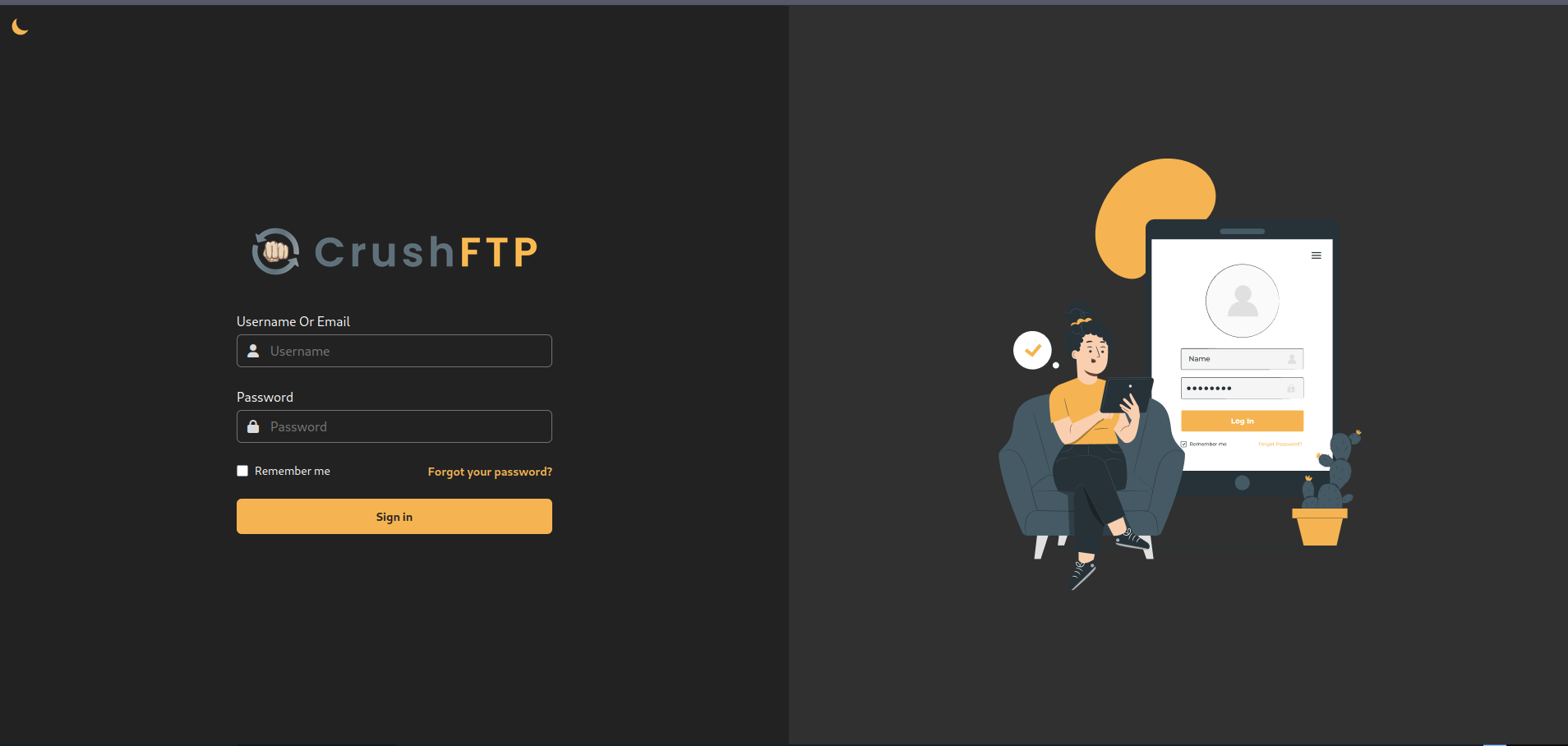 We get a new subdomain, which after adding it to our hosts file we can visit. The site reveals a CrushFTP instance which is a popular FTP server with a web interface.