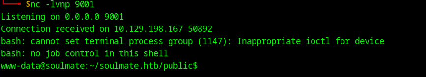root 1181 0.0 0.0 3104 1900 ? S 00:17 0:00 inotifywait -m -r -e create --format %w%f /var/www/soulmate.htb/public